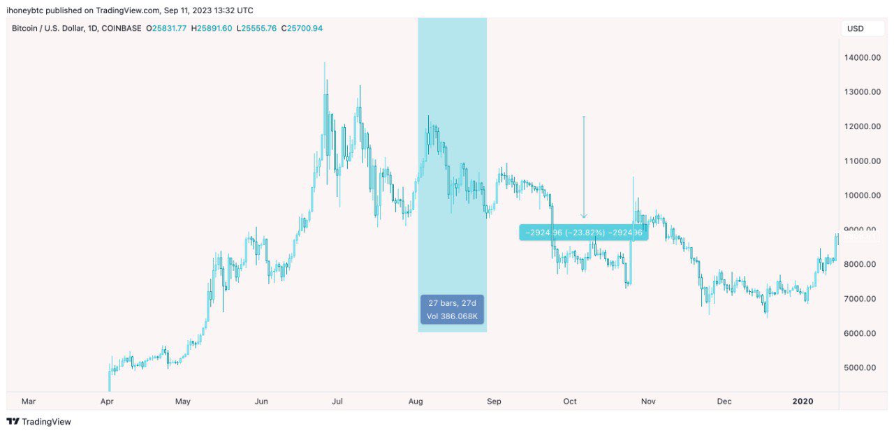 在 2020 年,鬼月从 8 月 19 日开始,至 9 月 16 日结束。在此期间,比特币的价格从高点的近 12,000 美元下跌至 10,000 美元附近,跌幅近 17%。