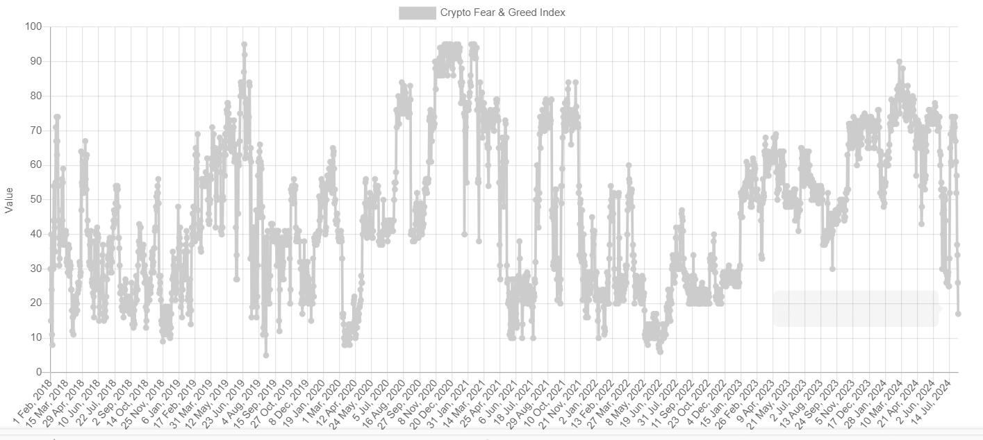 加密市场不太平,尤其是最近一周的行情表现让不少投资者感受到了市场血雨腥风。BTC 自 8 月 2 日以来连续 3 日大幅下跌,从 6.5 万美元狂跌至 5.7 万美元。昨日午间 2 时,BTC 最终在不断阴下跌之后,失守 5 万美元关口,最低下探 4.9 万美元,市场情绪陷入绝望。据 Alternative 数据显示,加密恐慌与贪婪指数跌至 20 下方,创下 2022 年 8 月以来新低(极度恐惧)。BTC 此后数小时皆在 5 万美元附近震荡,直到当日晚间 9 时才从 5.2 万美元附近稳步爬升,一路强劲上扬冲破 5.3 万美元、5.4 万美元,5.5 万美元,今日早间 8 时甚至回升至 5.6 万美元,随后于该位置上下震荡。BTC 至此结束日线四连跌,终于回稳价格表现由跌转涨。