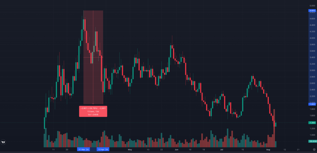 以 WIF 为例,目前 ATH 后的最大回撤差不多在 59%。这种策略利用了 MEME 币的波动特性和市场情绪。