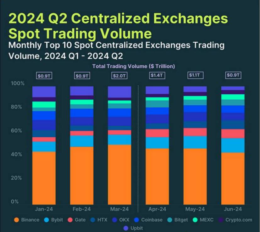 CoinGecko数据统计显示,2024年第二季度CEX现货交易量达3.4万亿美元,环比下降12.2%。币安仍然是最大的CEX,市场份额高达45%,Bybit市场份额增至12.6%。虽然交易所新上线的币种数量明显增加,但是在排名前十的CEX中,只有四家交易量有所增长。