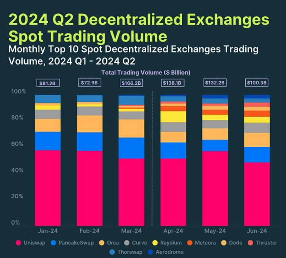 而在DEX市场,市场却出现了截然不同的数据增长。2024年第二季度,十大DEX的现货交易量达到3707亿美元,环比增长15.7%。Uniswap仍然是DEX的主导者,其市场份额占比高达48%。