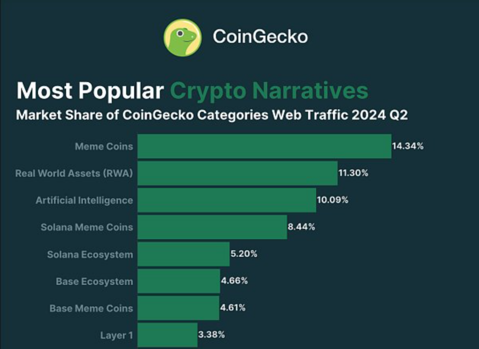 DEX相对CEX的逆势增长,主要归功于第二季度的meme币种数量激增和交易量的大幅度提升。因为大多数的meme币的诞生与前期发展都依附于DEX,数据显示,meme币是2024年第二季度最受欢迎的叙事,占市场份额的14.3%。其中,前15个最受欢迎的加密叙述中有4个与meme币有关。所以今年上半年meme币的大规模出现,大大提高了DEX的交易量,这也在一定程度上反映了用户流量和资金的流向,更多用户成为meme币的持有者。