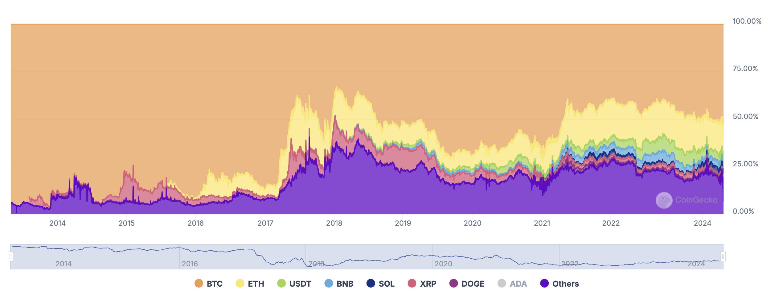 加密市场在强势反弹下收复部分失地,总市值一举反弹回攻至 2 万亿美元以上。CoinGecko 数据显示,加密货币总市值为 2.1 万亿美元,其中 BTC 市占率为 52.4%,创 2021 年 4 月以来新高,ETH 市占率为 14.2%。