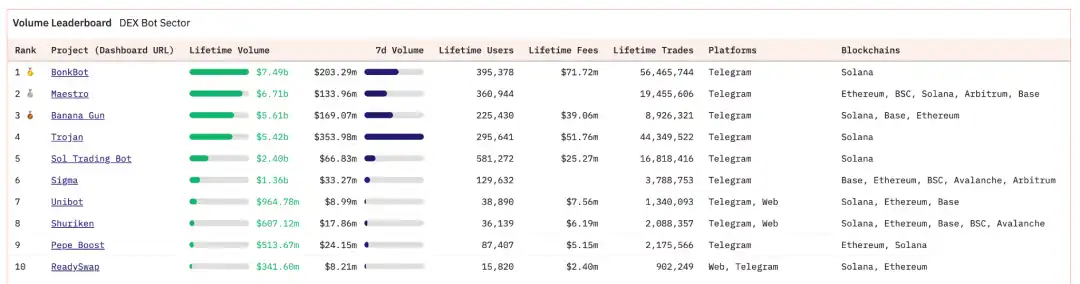 目前 Bot 赛道已经较为成熟,根据下图 Dune 数据,目前交易量排名前五的 Bot 是:BonkBot、Maestro、Banana Gun、Trojan、Sol Trading Bot。