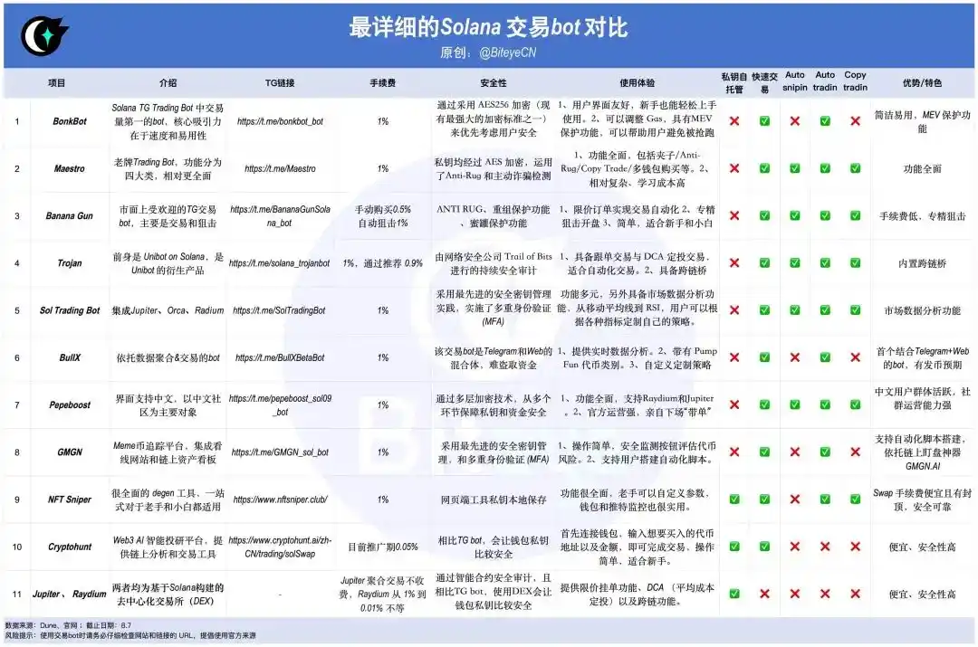 参考下图,我们在这篇文章中会从手续费、安全性、使用体验、功能优势/特色等维度,详细对比介绍目前主流的 Solana 交易 bot,同时与传统 DEX 相比较。详细介绍请阅读文章全文。