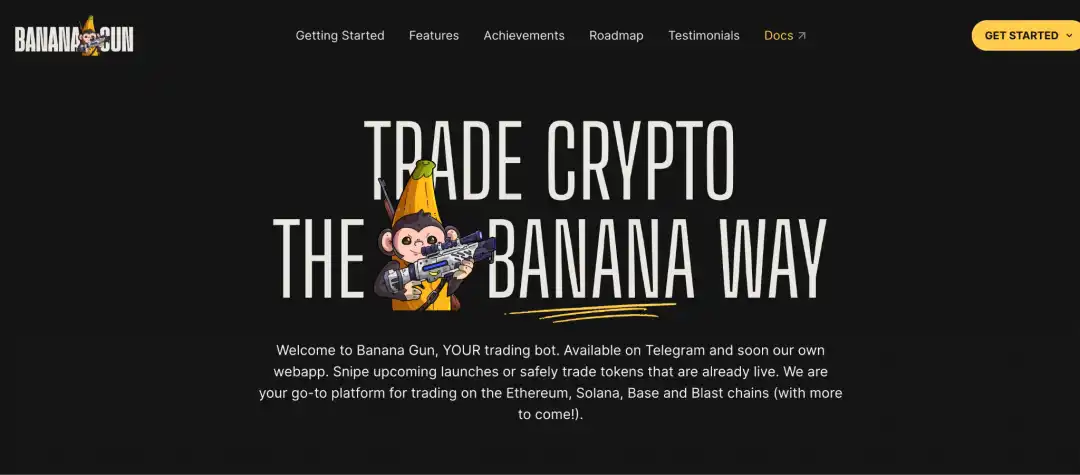 Banana Gun 在 Solana TG Trading Bot 中交易量排第三,也是市面上比较受欢迎的 TG 交易 bot,主要是交易和狙击两大功能,支持 Solana、Base、Ethereum 这三条公链。