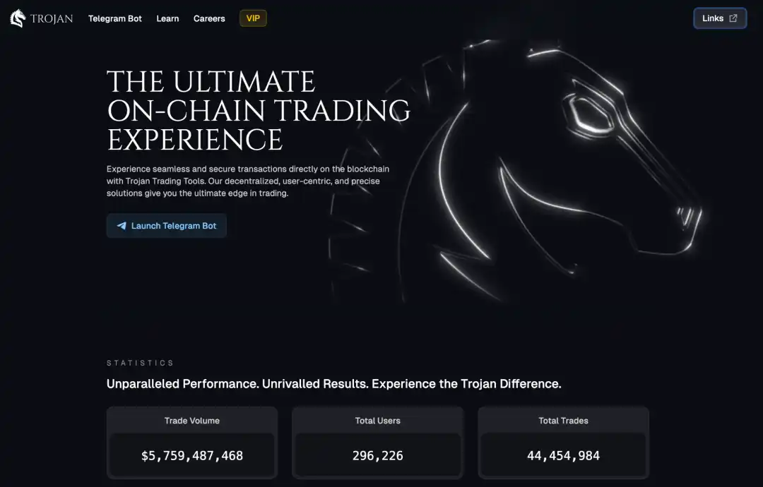 Trojan 的前身是 Unibot on Solana,由前 Unibot 社区营运负责人 Reethmos 带领制作的,是 Unibot 的衍生产品。交易界面与 Unibot 风格类似,是 Solana 链上交易量排名第四的 TG Trading Bot。