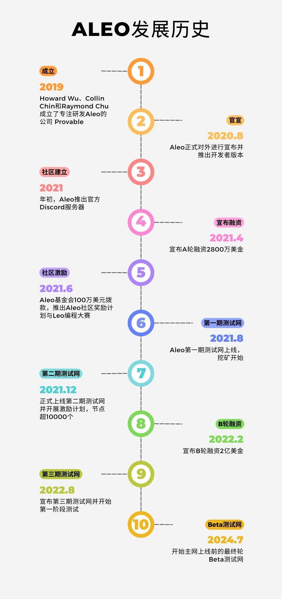 Aleo团队由来自谷歌、亚马逊和Meta等知名公司,以及加州大学伯克利分校、纽约大学和康奈尔大学等研究型大学的世界级密码学家、工程师、设计师和运营专家组成。其中核心开发团队注册在名为 Provable 科技公司旗下,Provable的联合创始人为 Howard Wu、Collin Chin和Raymond Chu,为加州大学伯克利分校校友。