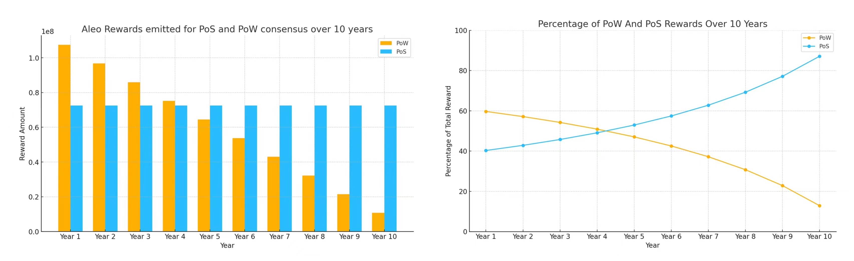 • 主网启动后,Aleo 网络将向zk证明者以及验证者发放 Aleo 积分作为奖励。证明者和验证者获得的 Coinbase 奖励在约 10 年内线性下降