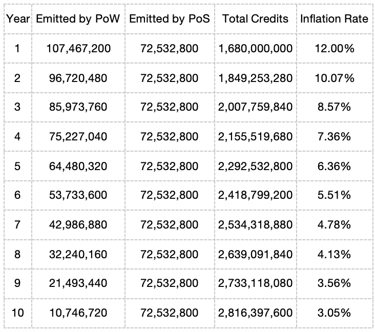这是我们根据部分官方数据推演的Aleo 积分在初始发行之后10年内的年增长量和对应的通胀率计算: