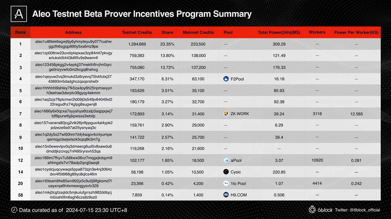 以下是我们总结Beta 测试网期间获得 Top 10 积分的 Aleo 地址与其部分地址对应的矿池数据对比: