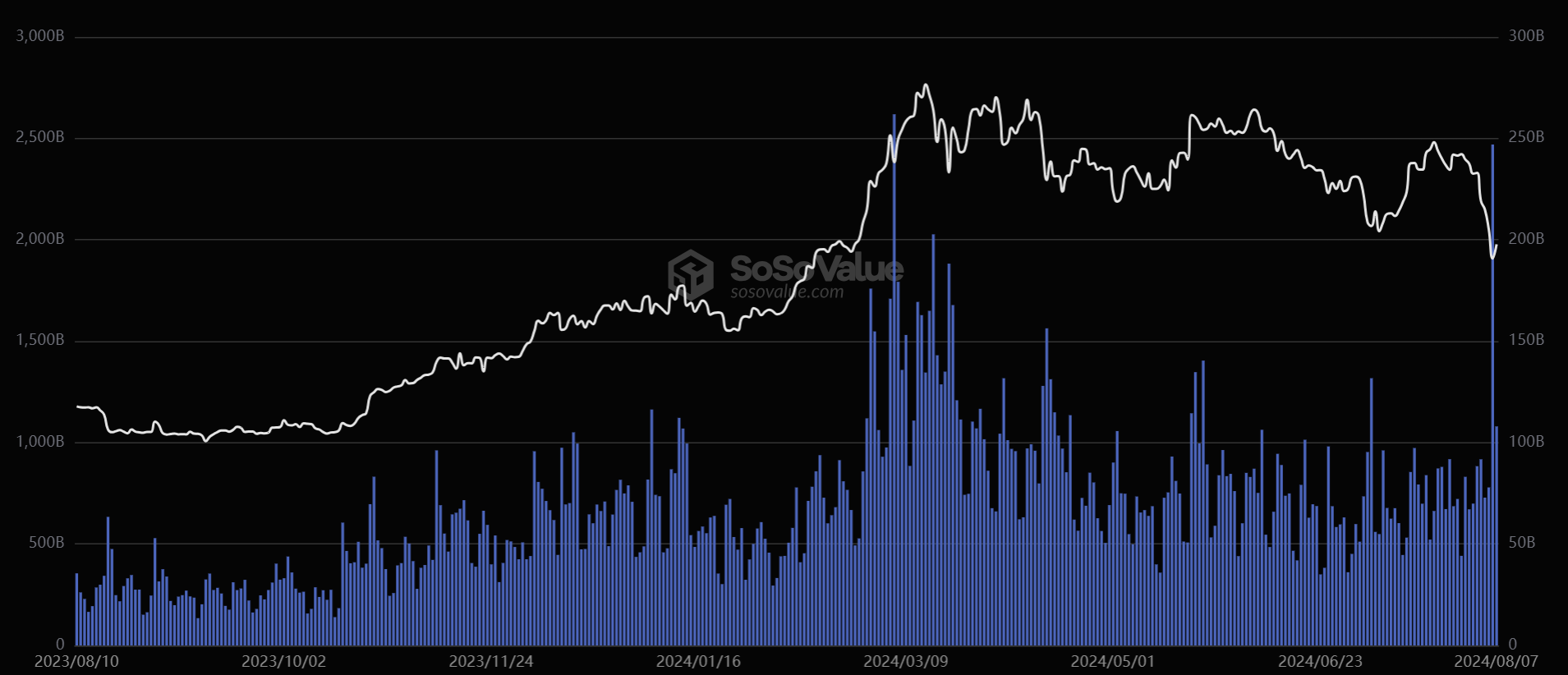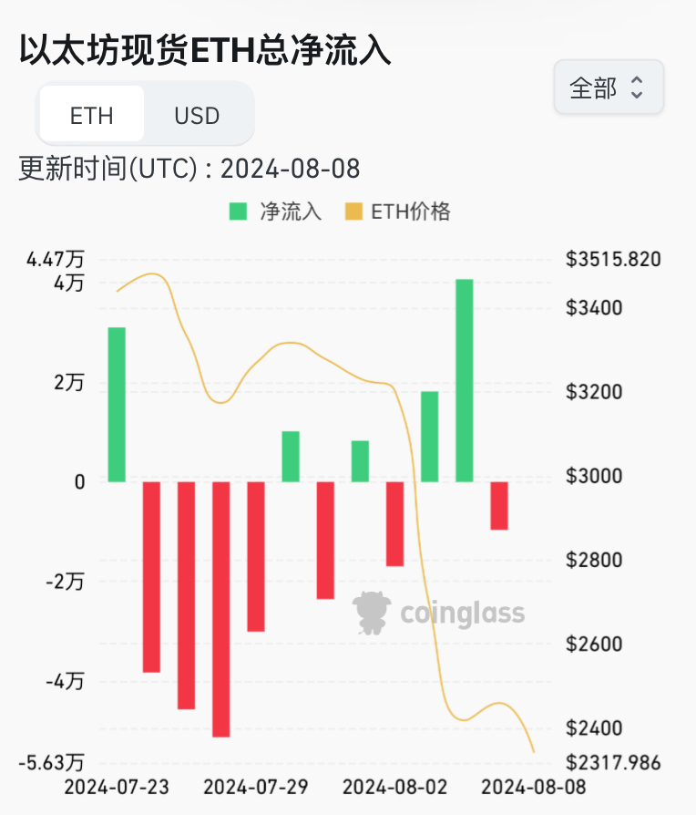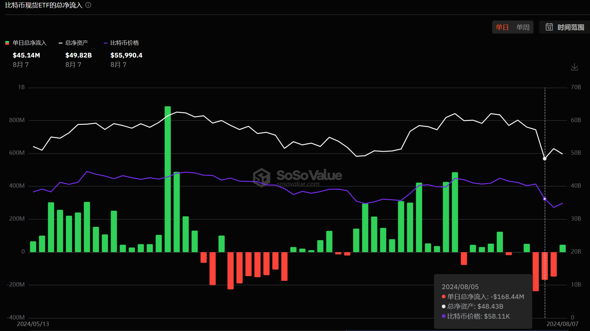 上周五8月2日,比特币现货ETF总体净流出2.37亿美元,主要流出来自于富达FBTC的1.04亿美元和方舟基金ARKB的8700万美元。以太坊ETF净流出5400万美元,主要来自灰度ETHE,其他ETF只有一些小额交易。
