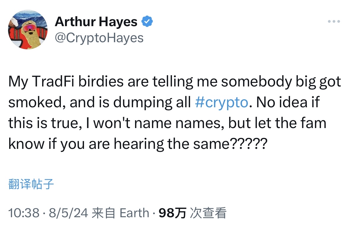 8月5日,BitMEX创始人、知名KOL Arthur Hayes发推称,其从消息人士处得知,某巨鲸遭重创,正抛售所有加密货币。“不知道这是不是真的,我不会说出名字。”目前大部分社区用户猜测该巨鲸为Jump Trading。