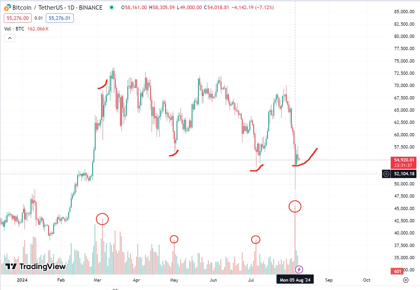BTC和ETH在8月5日的交易量创下了历史新高,由下图历史统计上看,价格会因这样的数量而逆转。虽然并不能保证立即逆转,下跌速度也会因此放缓。