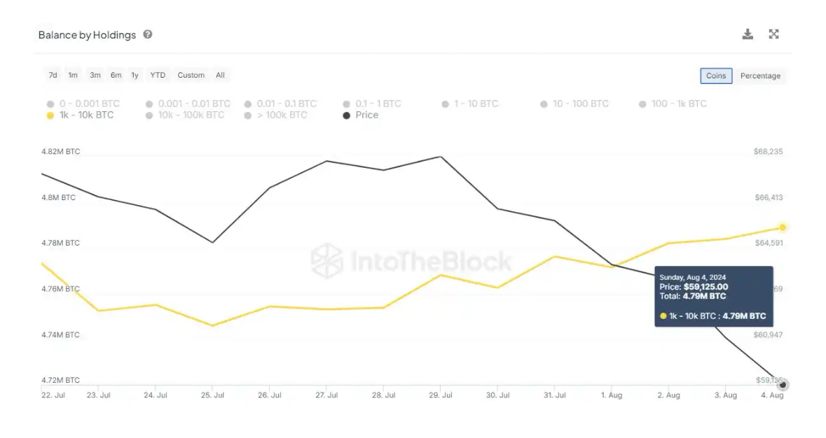 持有1000枚以上比特币的巨鲸在下跌中不断增持。