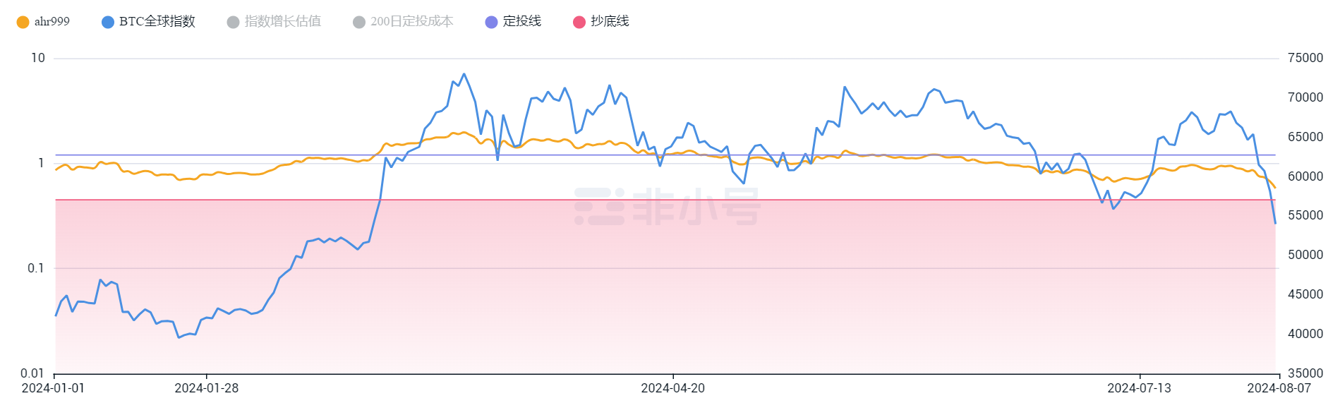 AHR999指数:8月7日AHR999指数为0.61,指数自8月5日以来大幅下跌。目前200日定投成本为60950美元,理论定投区间为0.45-1.2,当前55000左右的价格对于长期主义者来说是一个较好的买入时机。