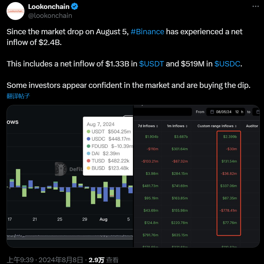据Lookonchain数据监测,CEX稳定币资金持续流入,自8月5日大跌以来,Binance经历了24亿美元的净流入。这意味着投资者似乎对市场充满信心,正在逢低买入。