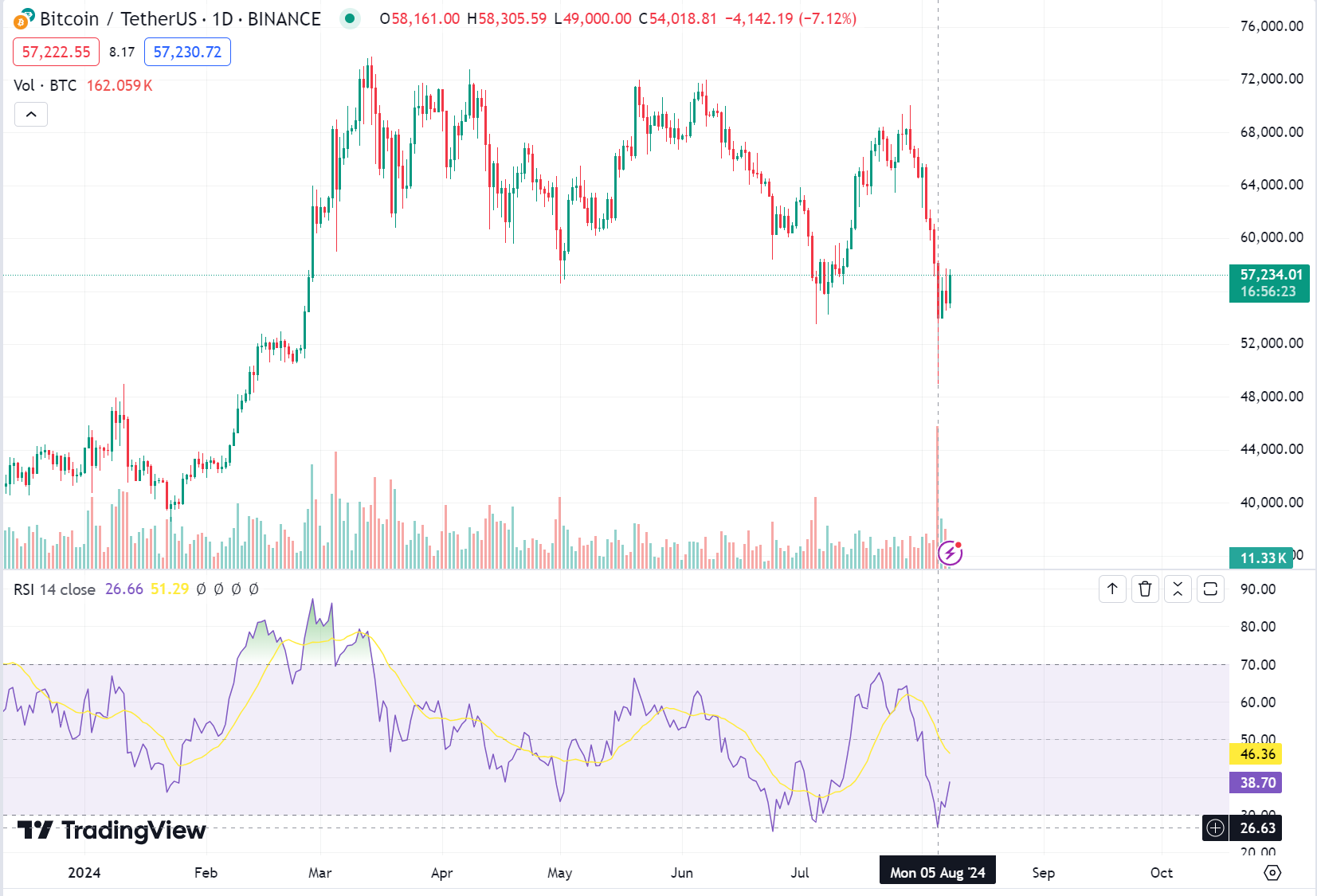 在周一的暴跌中,加密市场同样遭受了重创。BTC价格在日内两次跌破5万美元,插针至4.89万美元,最大跌幅超15%,BTC周线布林线跌破下轨。ETH更甚,受Jump Trading疑似清仓消息影响,一度跌至2100美元,跌超22%,抹去 2024 年全部涨幅。SOL相对抗跌,日内插针至110美元后迅速反弹,最终收跌6%,难以想象仅仅一周,SOL就从193美元的高位下跌至此,其他加密货币也纷纷崩盘,市场哀嚎一片。此次暴跌引发了市场恐慌,恐惧与贪婪指数在当日降至26,表明市场处于“恐惧”状态。
