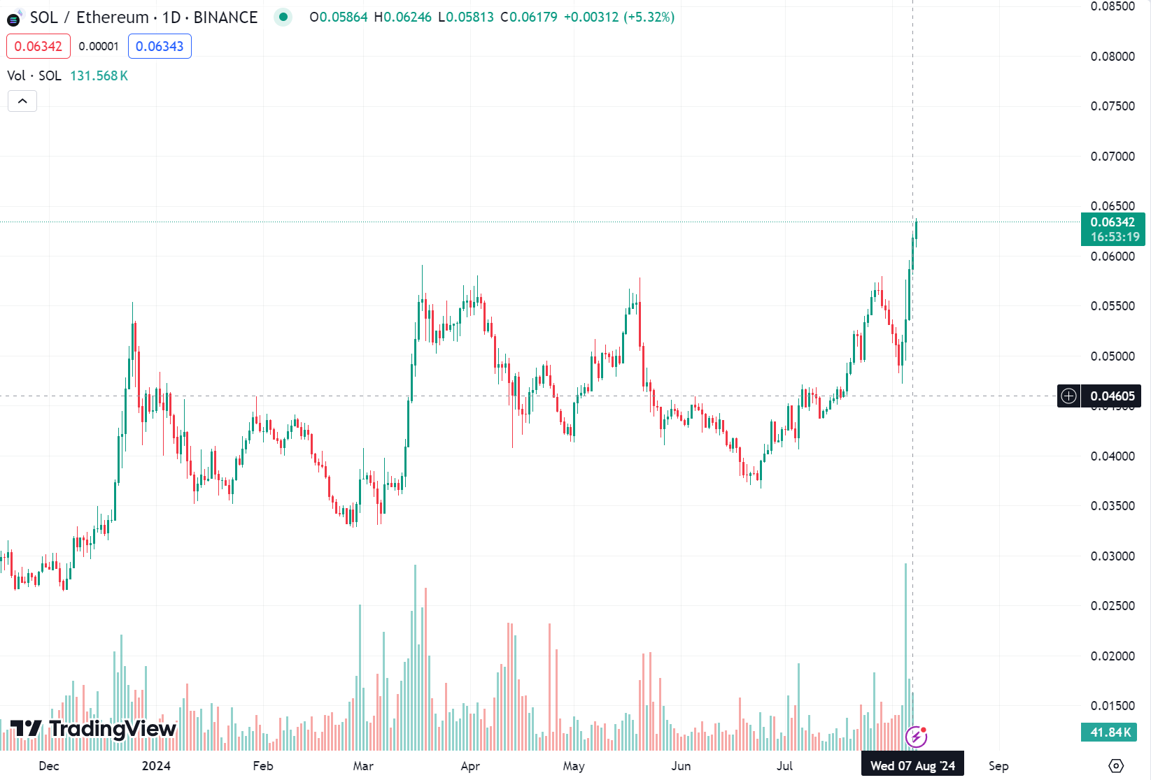SOL/ETH汇率在8月7日突破0.06,创下历史新高,市场情绪并非一蹶不振。