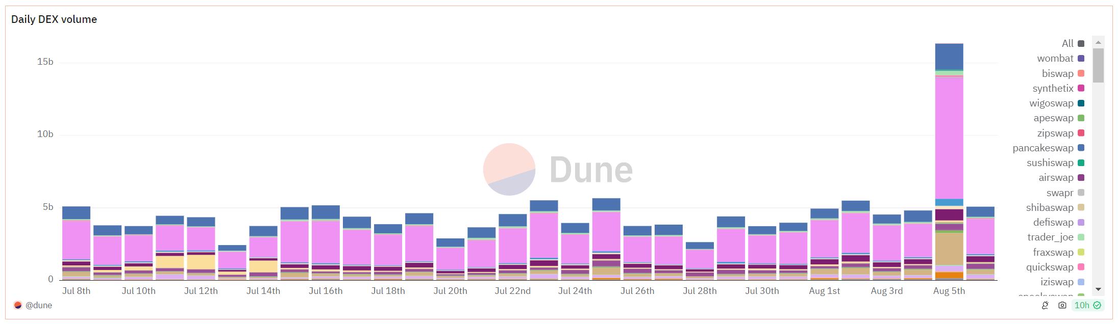 据DUNE数据监测,8月5日DEX的总交易量超过202亿美元,创历史第三高记录,山寨币交易活跃。