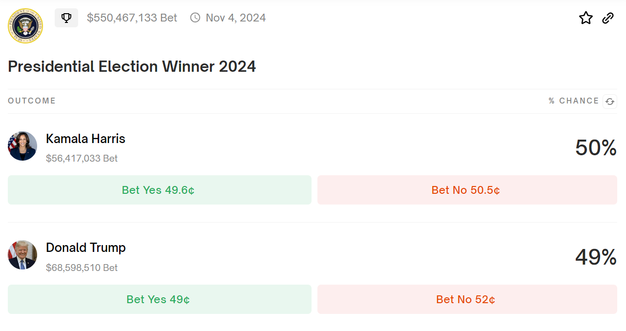 再来看加密预测市场Polymarket上,截至发文前的8月8日数据,哈里斯当选概率为50%,已超过特朗普的49%。