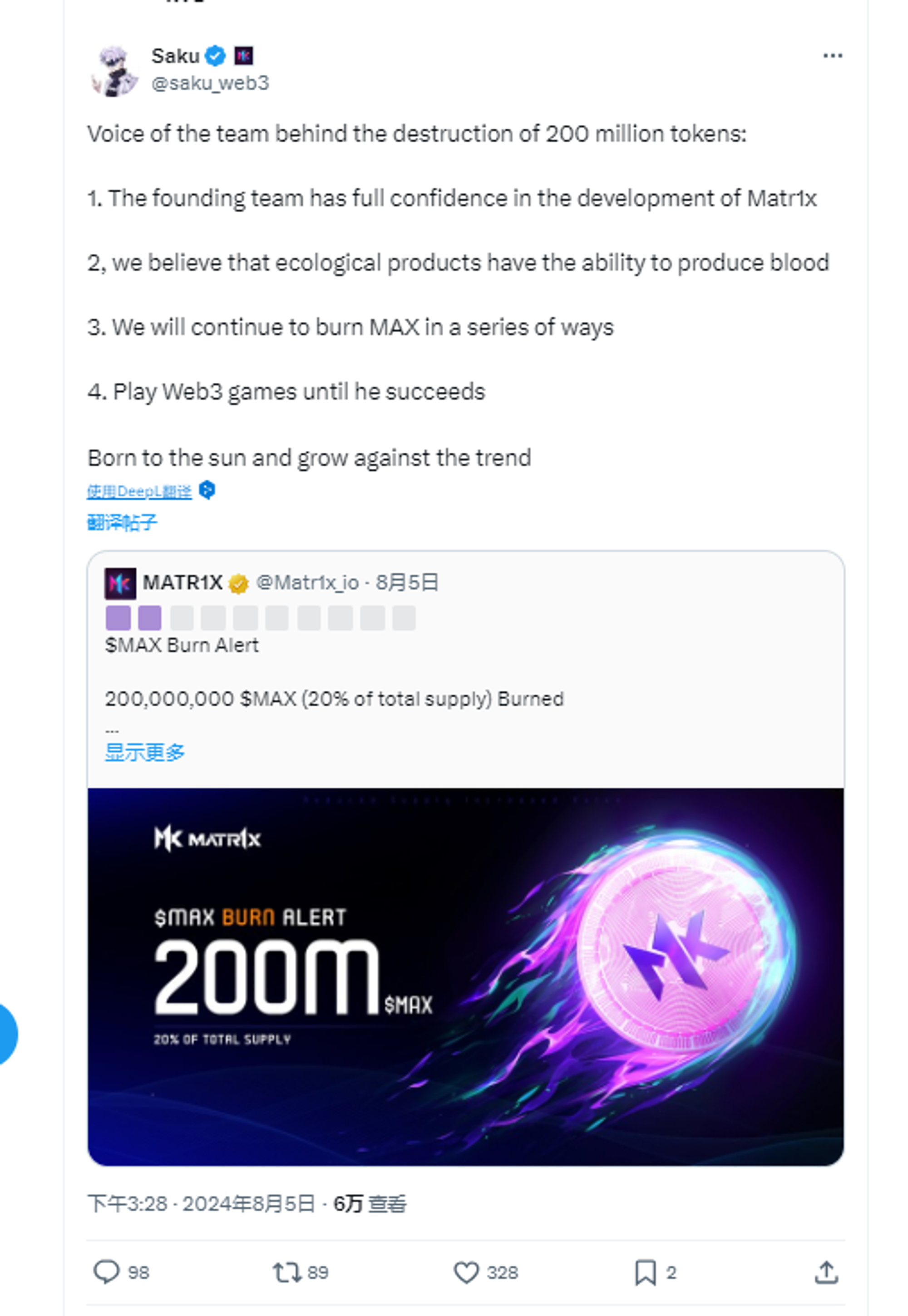 这一操作令许多人感到困惑。通常,这样的大规模利好消息会选择在盘后公布,以期推动币价表现并提振市场信心。然而,考虑到8月5日当天的黑天鹅事件,MATR1X可能希望在开盘前增强市场信心。MATR1X创始人在推特上表示,他们相信MATR1X具有自我造血的能力,并计划通过各种手段持续保持通缩,主动降低FDV。