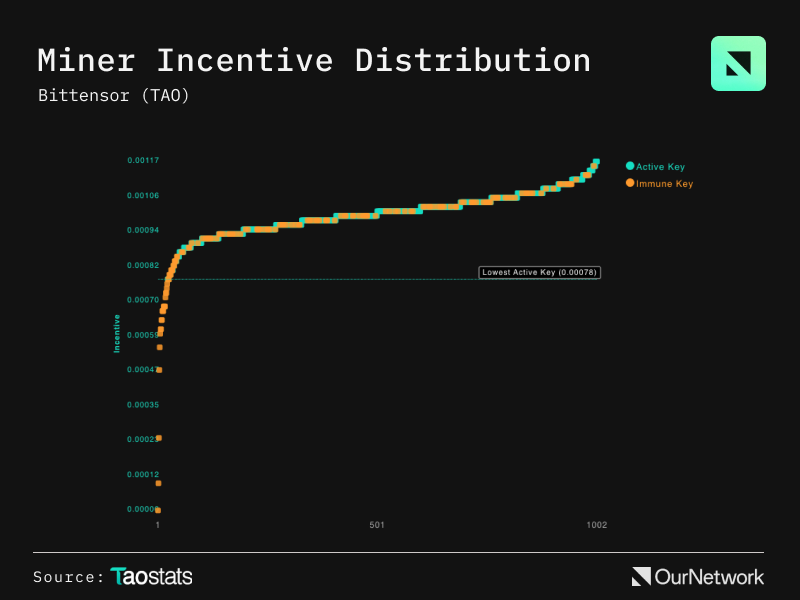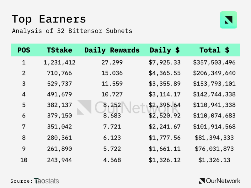 对 Bittensor 32 个子网络之一的分析显示,主要收入来源是持有大量股份的验证者。此外,最高收入者在超过 3.5 亿美元的股份下,每天的收入不到 8,000 美元。这引发了关于网络去中心化及其促进开放人工智能市场能力的问题。