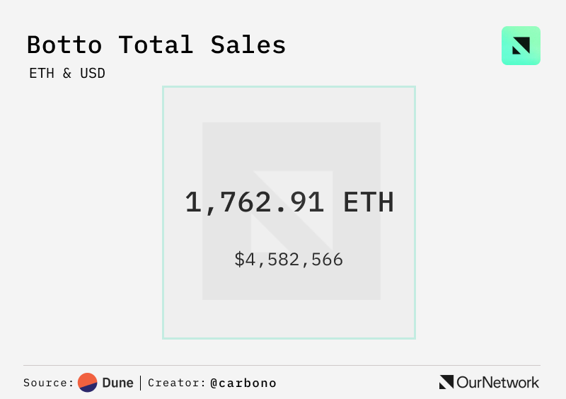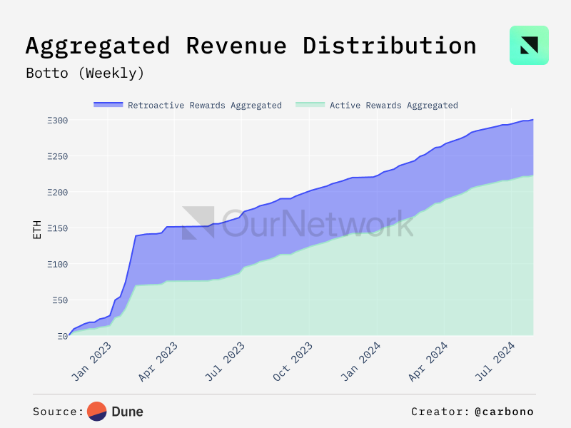 Botto 是一个去中心化的艺术 AI 实验,将每周 1/1 艺术销售的收益分配给训练其品味模型的用户。Botto 的 1/1 销售截至 2024 年达到了 100 ETH 的峰值,现在平均为 6 ETH,此外还通过二级销售、策划的收藏品和合作项目获得额外收入。Botto 在其收入分配模型中表现出色,DAO 实施了 50% 的收入分享,为社区创造了超过 300 ETH,这占总收入的 23%——这是人机协作的蓝图。