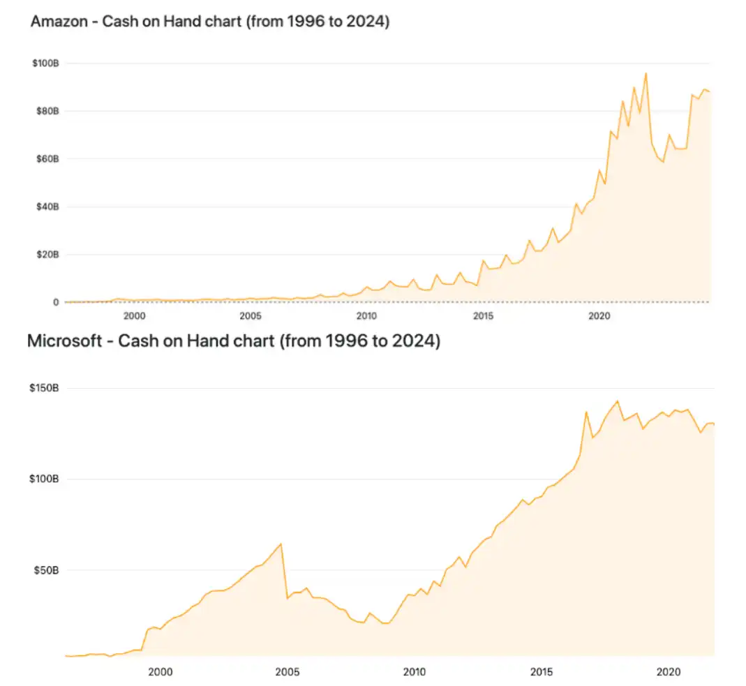 1996 年至 2024 年微软和亚马逊的现金储备。来源: Companiesmarketcap