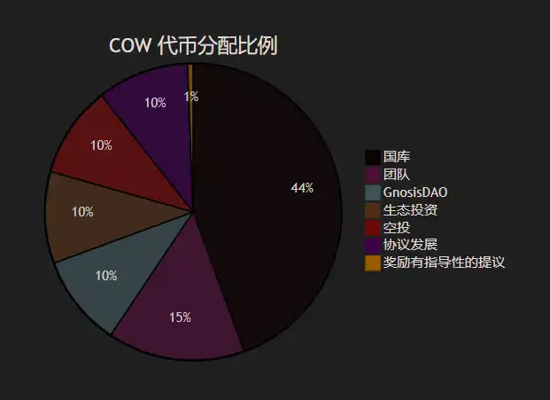 COW 是 Cow Protocol 的治理代币,总量 10 亿枚,流通代币 9025 万枚,占代币总量的 9.02%,市值 1 亿 4200 万美金;代币分配如下