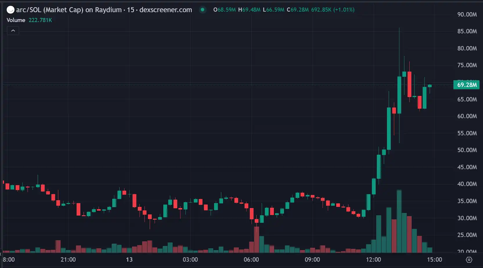 ARC 代币今天中午一个小时上涨 178.12%,达到最高市值 8620 万美元,势头强劲。
