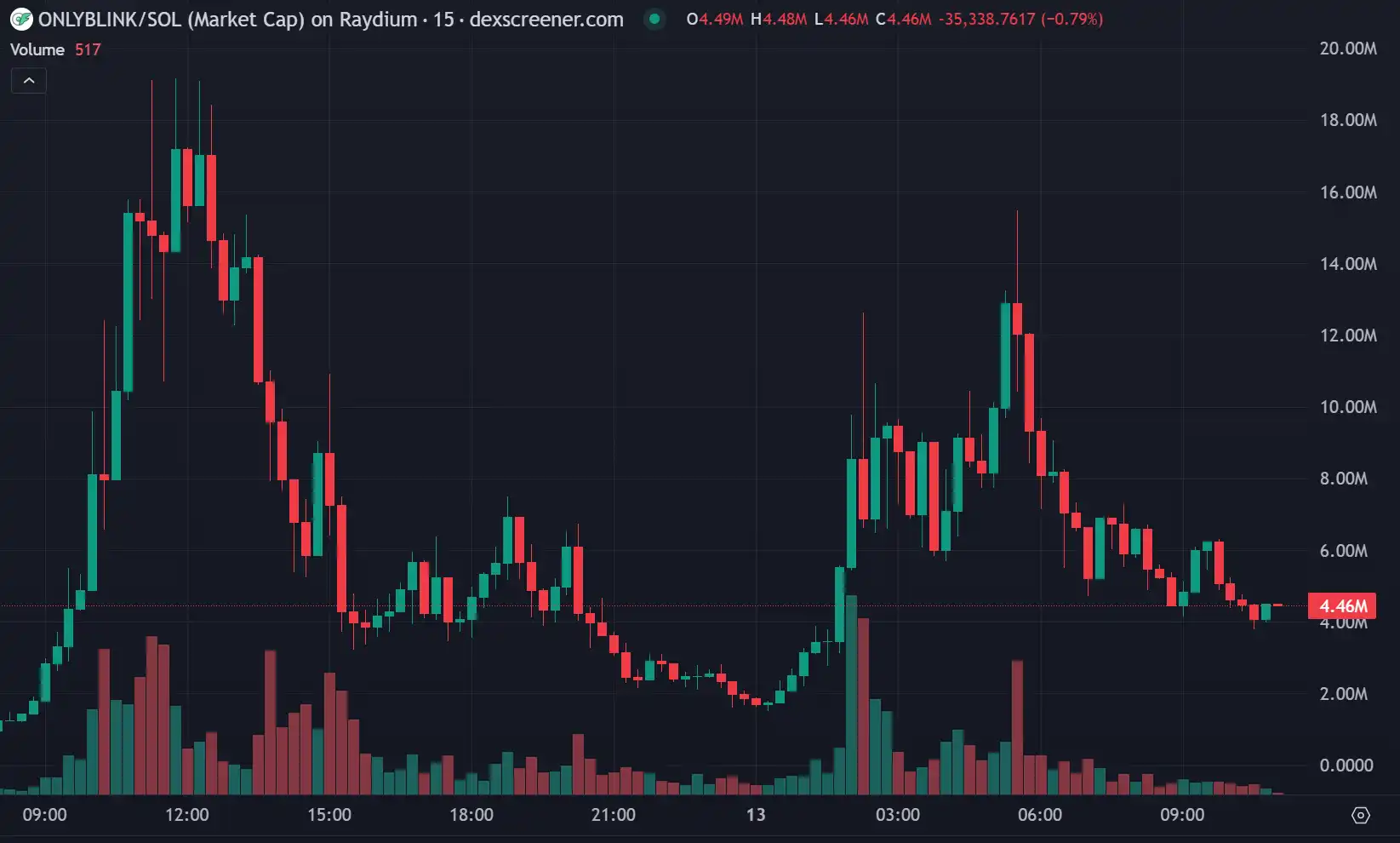 Onlyblink 是一个 NFT 平台,作为 BLINK 代币的测试平台,它并不是主要代币,而是与 blink 代币紧密相关的启动平台。用户必须支付 blink 代币才能启动 Onlyblink 平台。同时,onlyblink 代币也作为一个代币启动平台,与 Pumpfun 竞争。Onlyblink 在 12 号中午市值抬升迅速,市值在一个小时内增长 12 倍,达到最高市值 1914 万美元,随后马上回调。