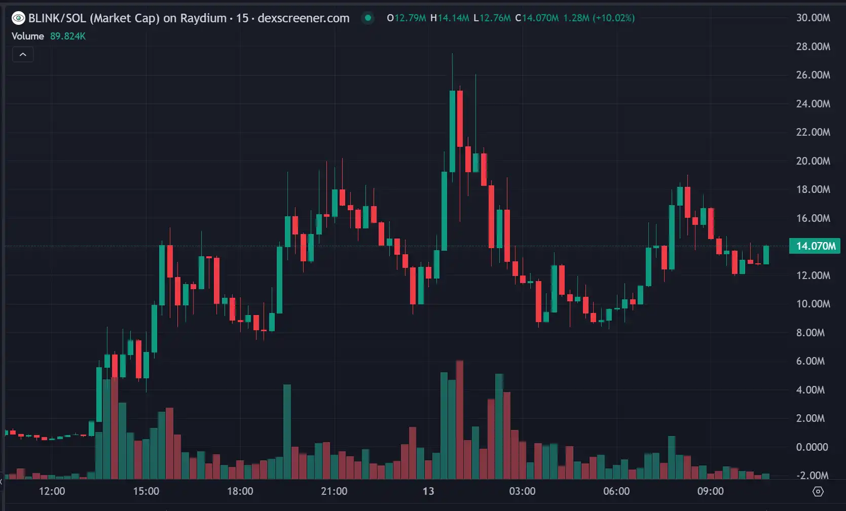 Blink 代币于 13 号凌晨市值上涨至最高点 2800 万美元,从 12 号中午开始就一直震荡向上,拉升到最高点涨了 33 倍。