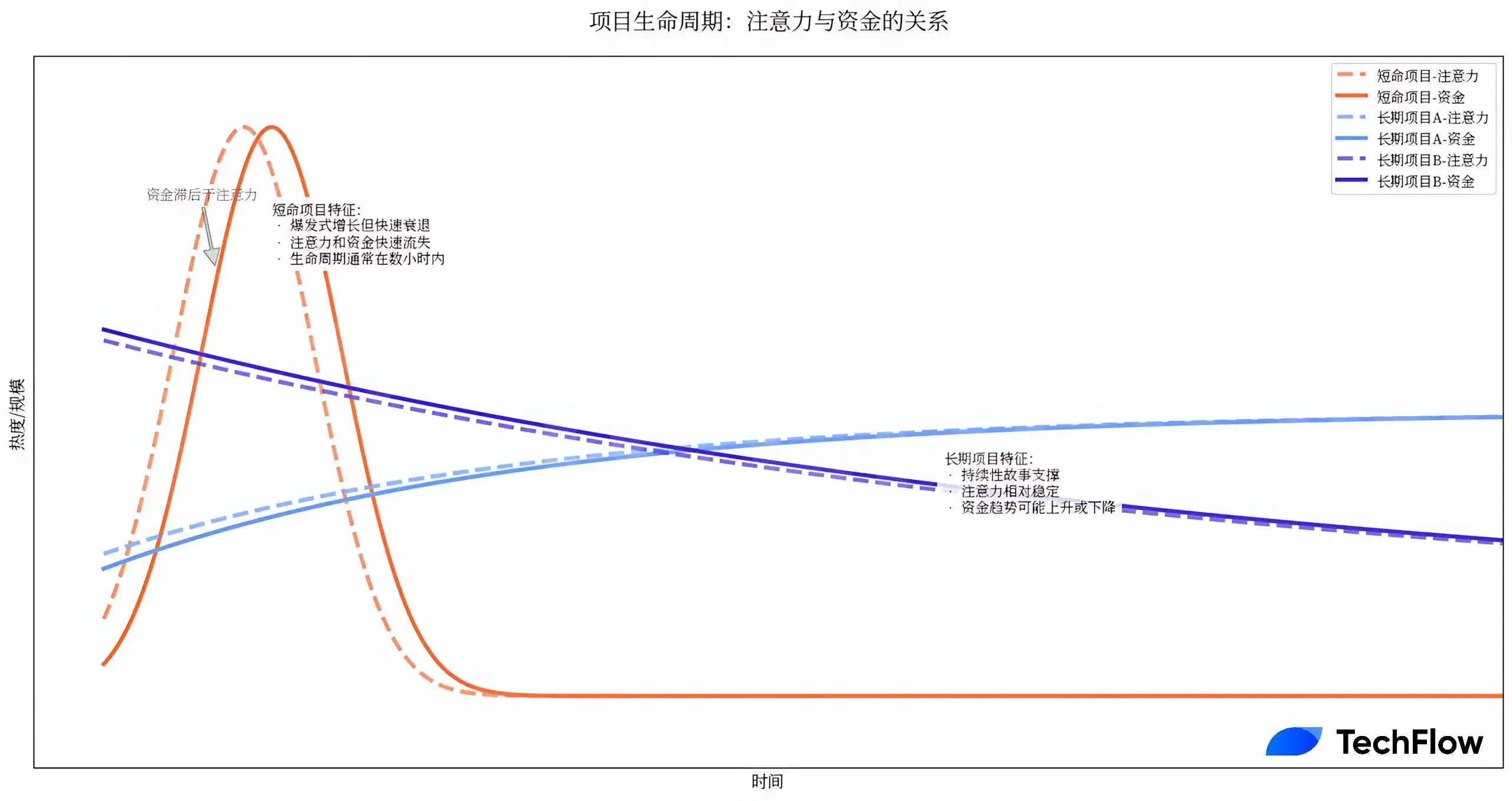 越能持久讲故事的项目,越能吸引注意力。而注意力驱动着热度,资金则搅动着涨跌。