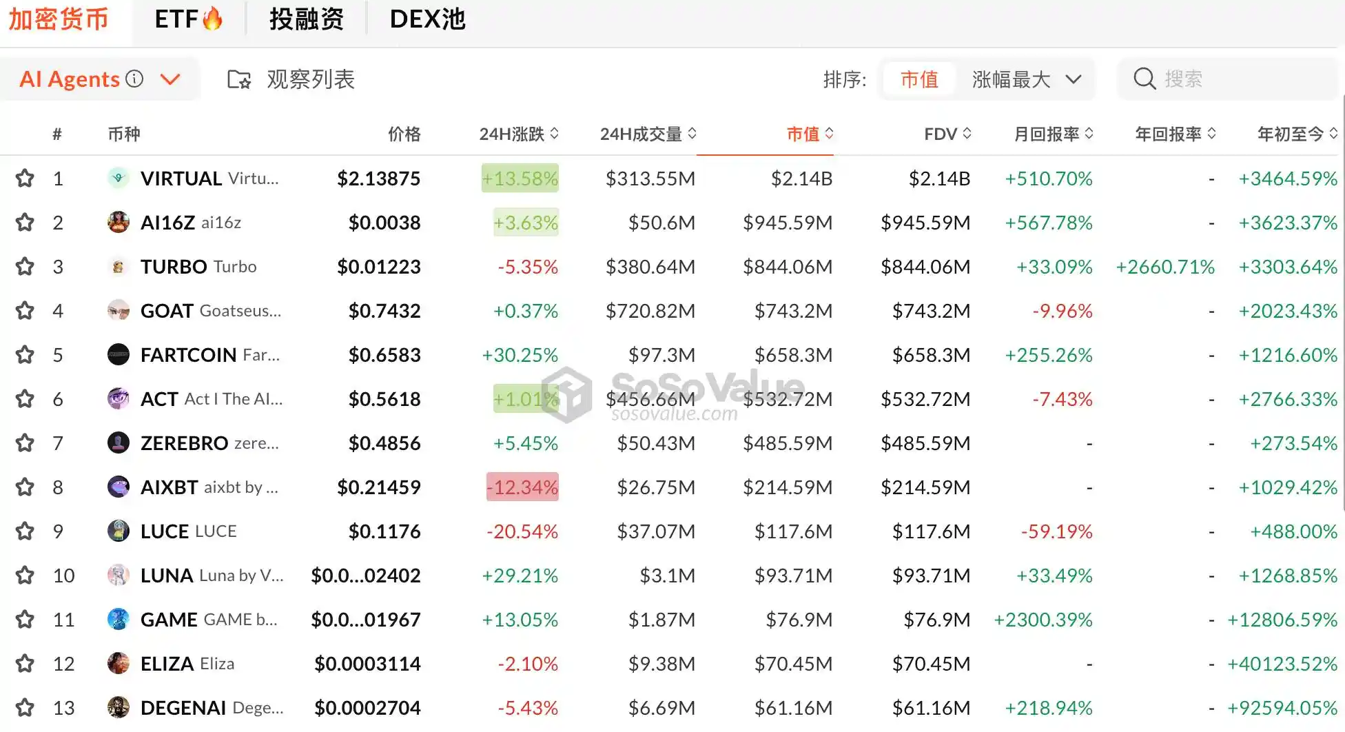 头部代币如 ai16z 和 Fartcoin 一路上涨,而尾部一天你甚至能看到几百个自称 AI Agent 的代币同时出现在监控列表中。