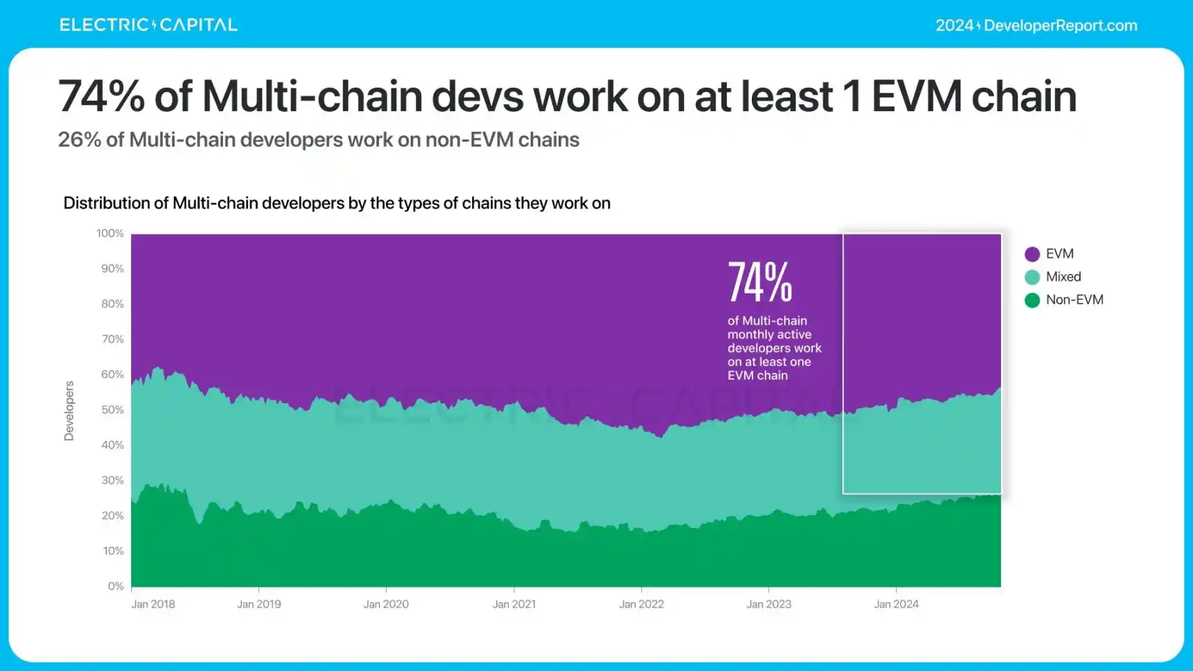 EVM 链共享了最多开发者,并且具有显著的网络效应:74% 的多链开发者在 EVM 链上工作。