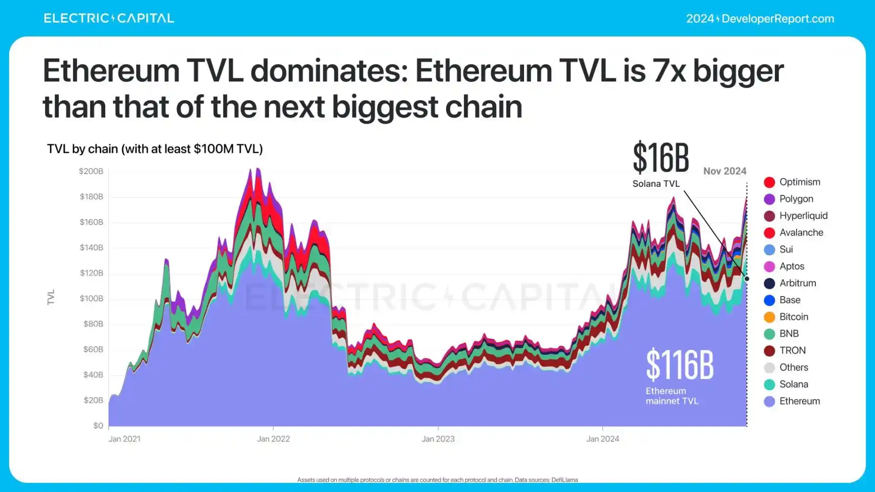 以太坊的 TVL 占据主导地位,是第二大链的 7 倍。