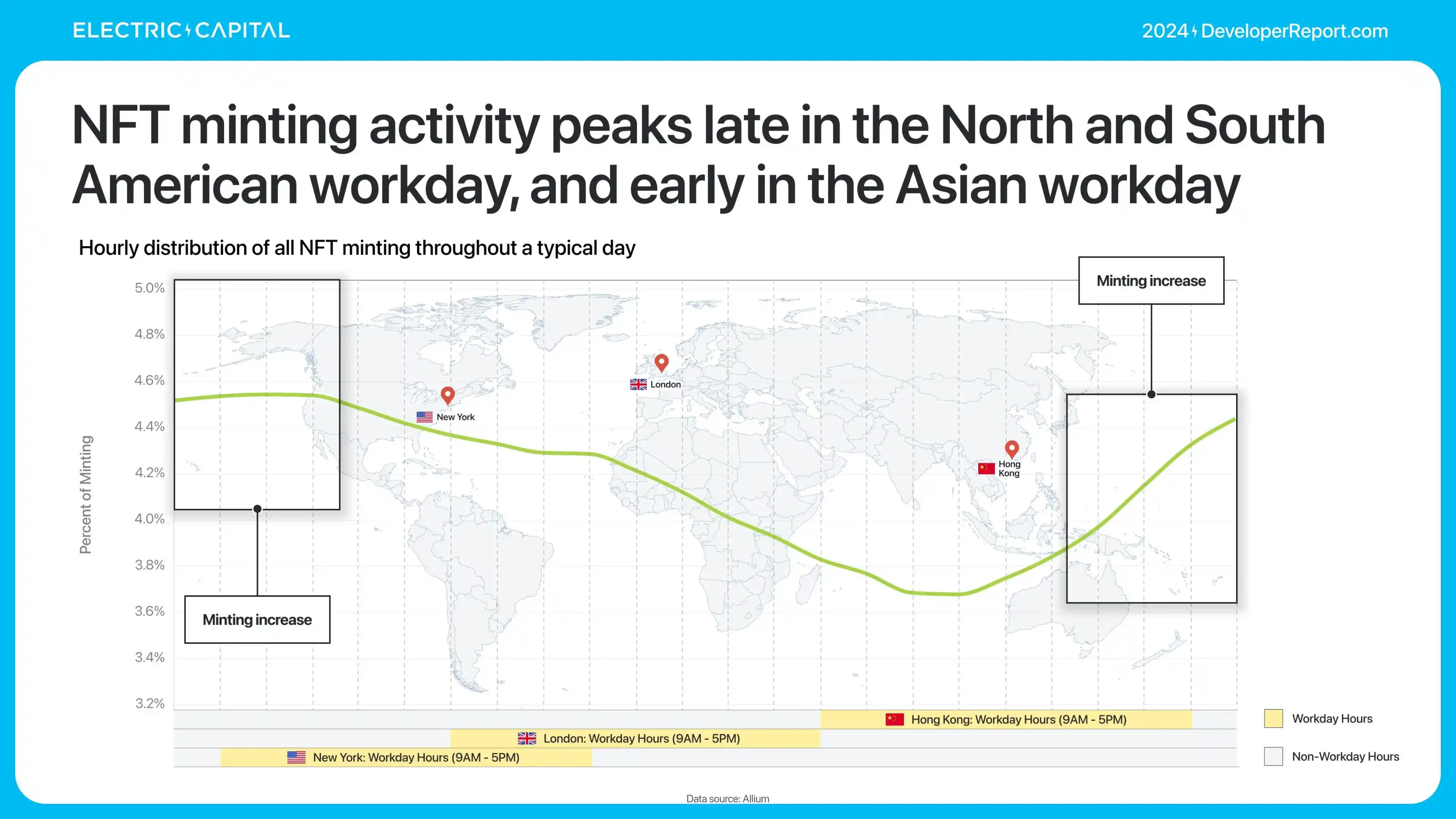 NFT 铸造和交易的交易量在不同地区达到峰值——这表明存在不同的用户群体。