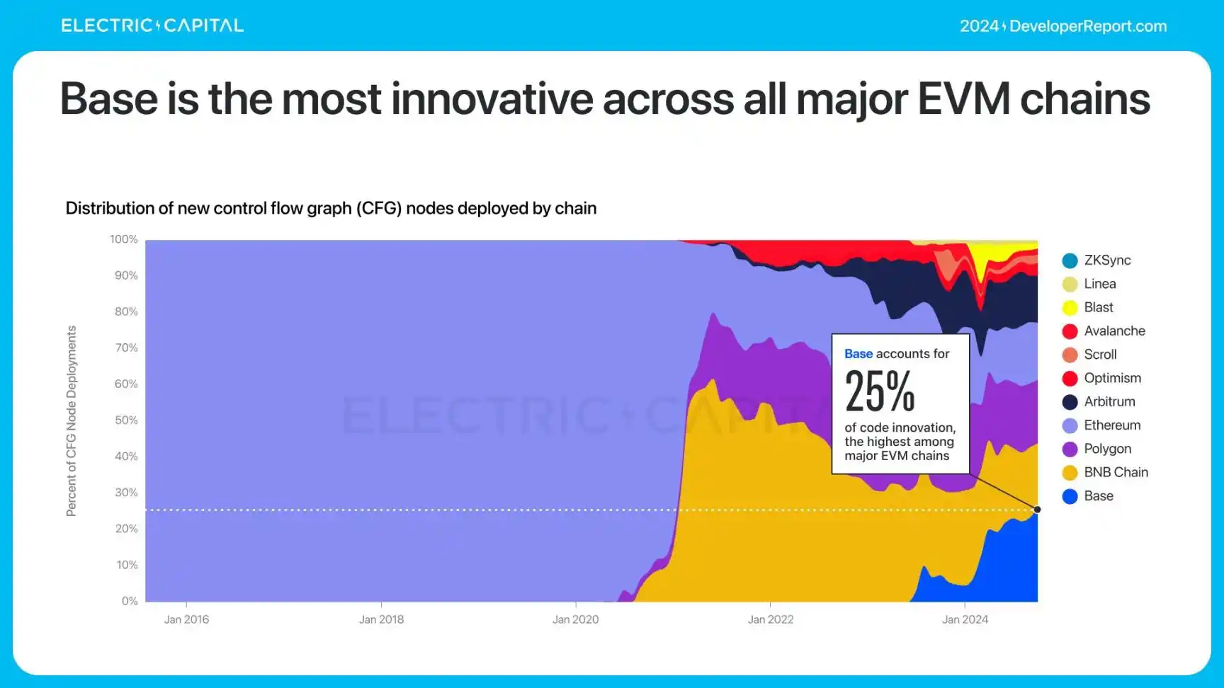 Base 现在占据了所有 EVM 链上原创链上代码逻辑的 25%,是所有主要 EVM 链中最多的。