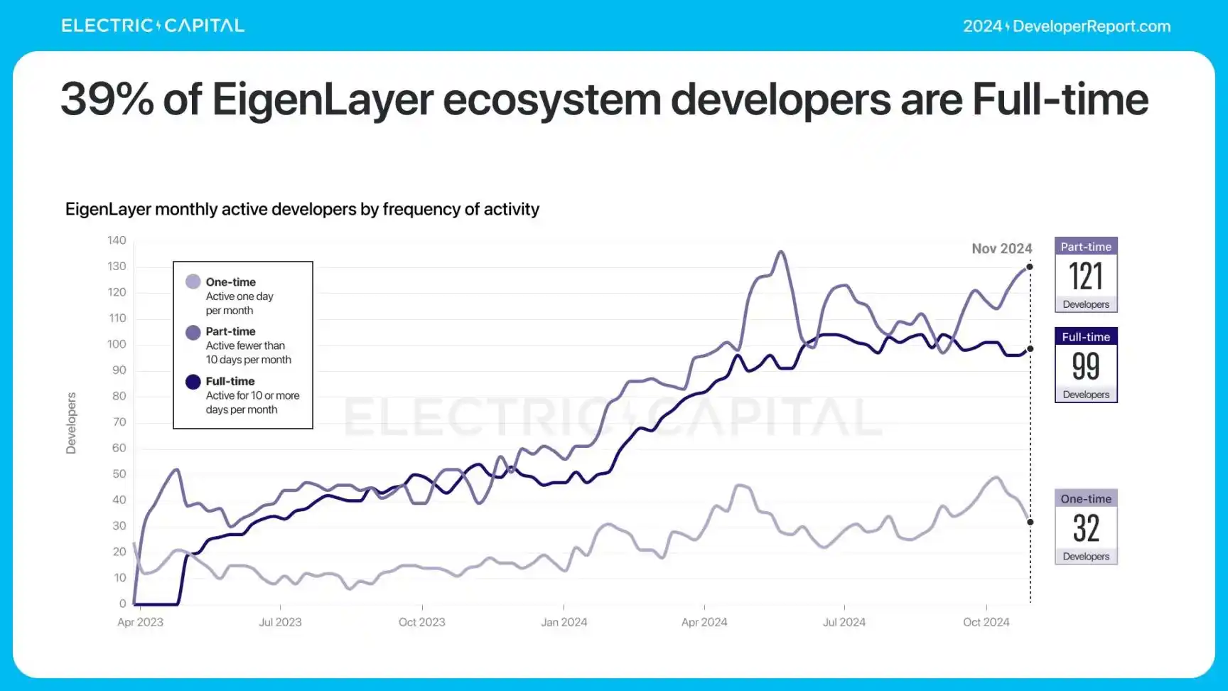 有 252 名每月活跃的开发者在 Eigenlayer 生态系统中工作。Eigenlayer 的开发者非常投入:39% 是全职开发者,超过一半的开发者在该生态系统中工作超过 2 年。