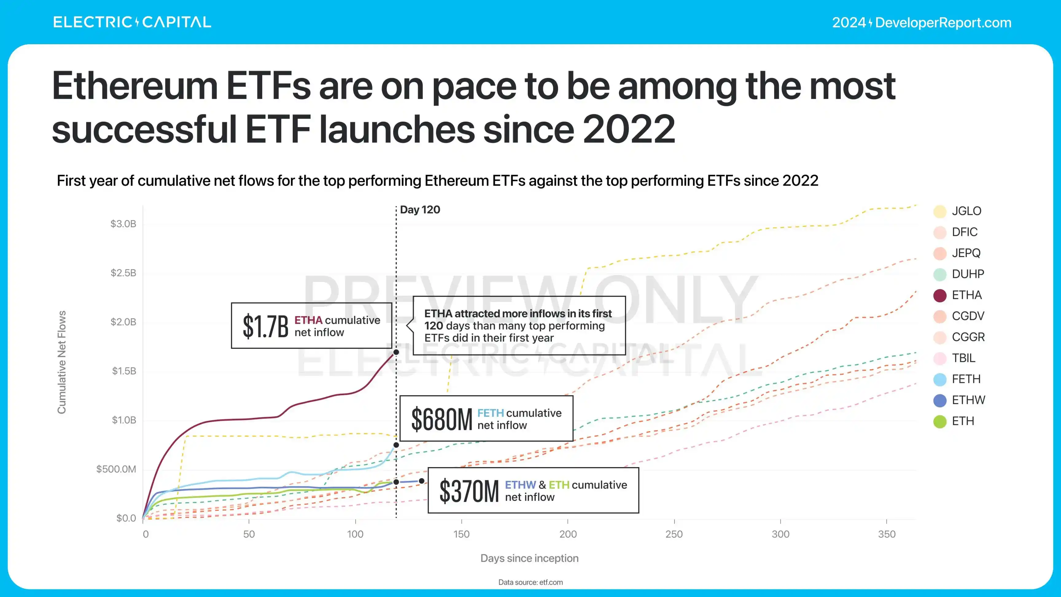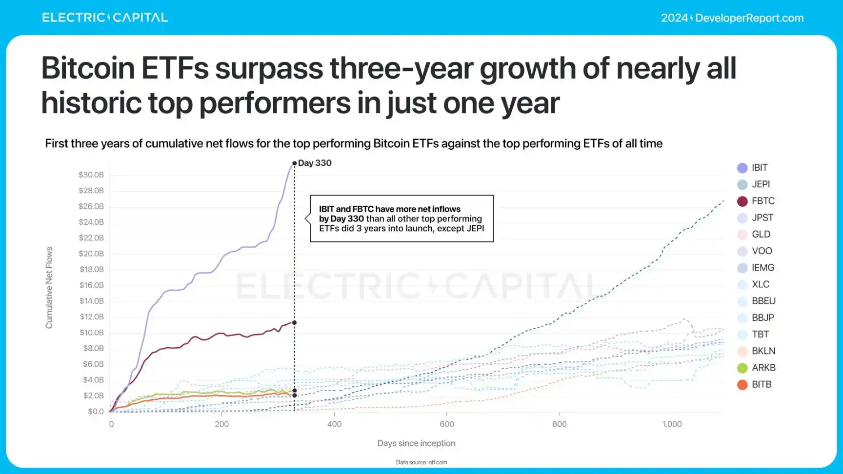 比特币和以太坊 ETF 创下了历史记录。在它们的第一年内,累计流入资金已是历史上最成功 ETF 的 2 倍以上。