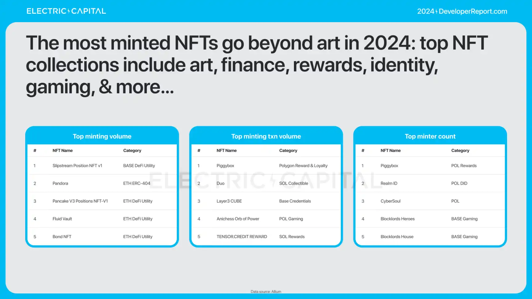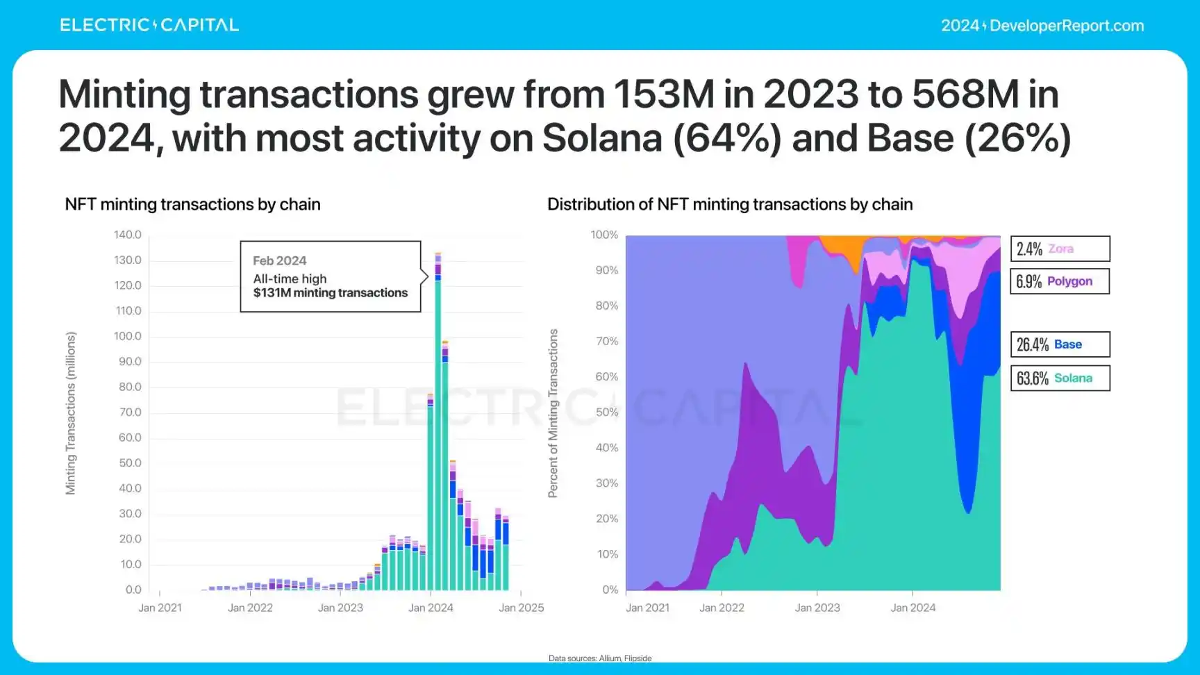 2024 年,NFT 铸造达到了历史新高,97% 的铸造发生在 Base 上。
