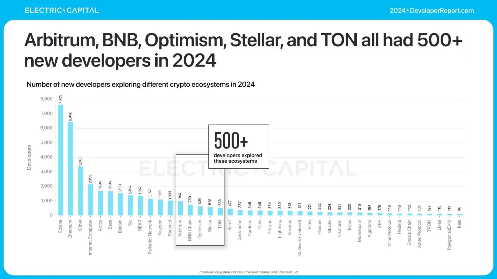 arbitrum、BNBCHAIN、Optimism、StellarOrg 和 ton_blockchain 都有超过 500 位新开发者加入。