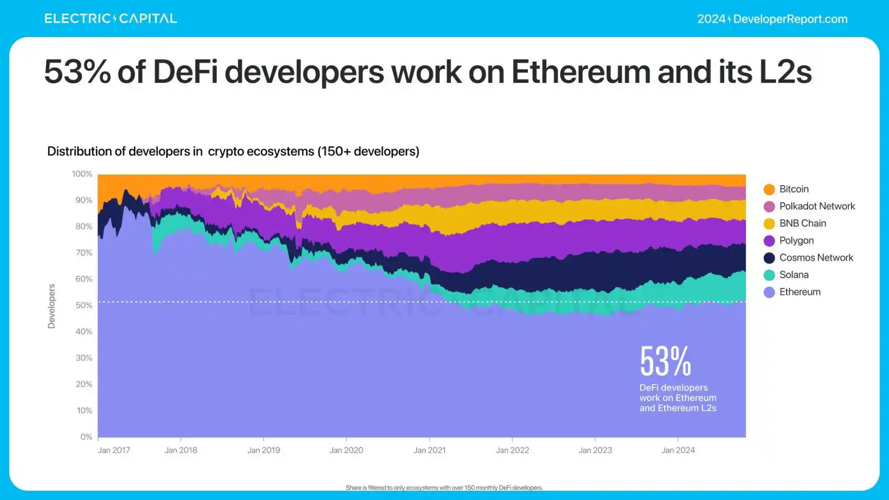 53% 的 DeFi 开发者在以太坊及其 L2 链上工作。
