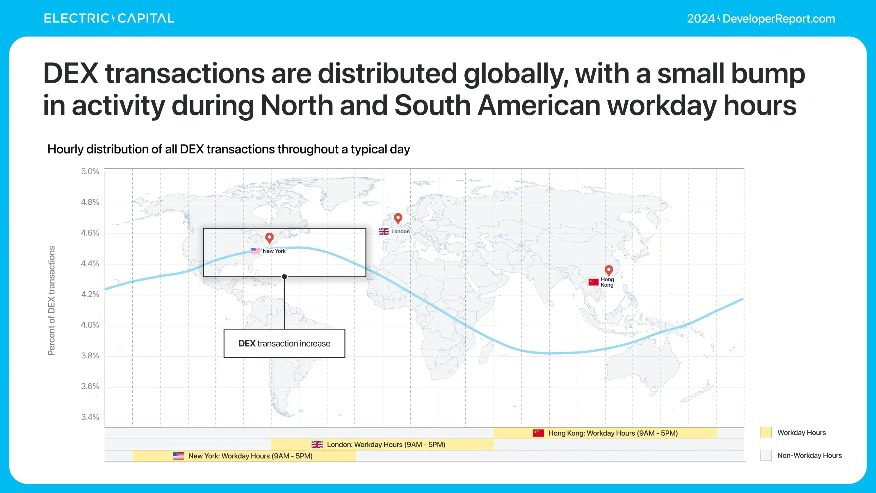 尽管稳定币交易在东半球的工作时间内达到峰值,但交易量更倾向于西半球。