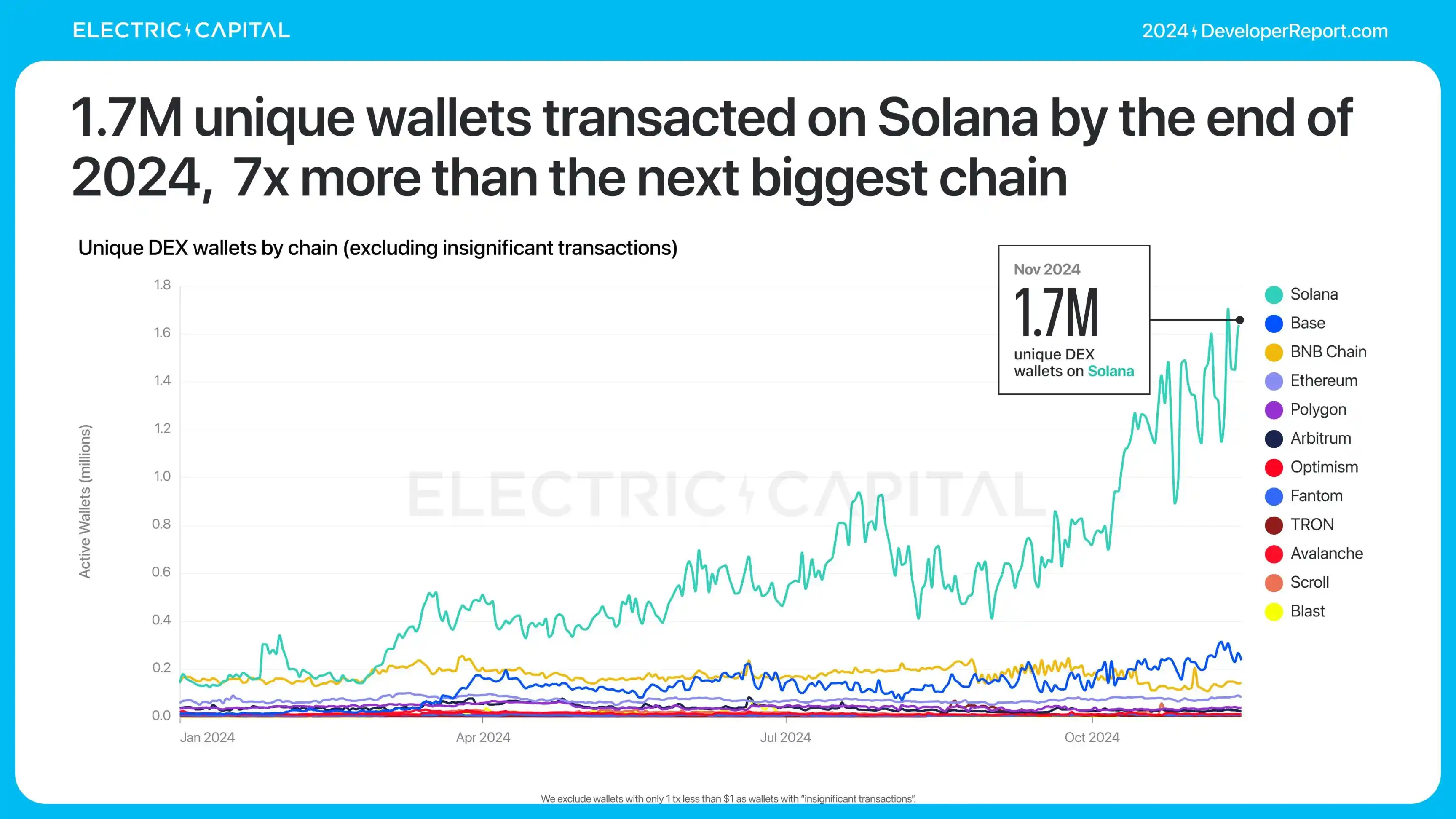 按交易钱包数量来看,排除了只有 1 笔交易且金额低于 1 美元的钱包。Solana 拥有最多的独立交易钱包,数量是第二大链的 7 倍。