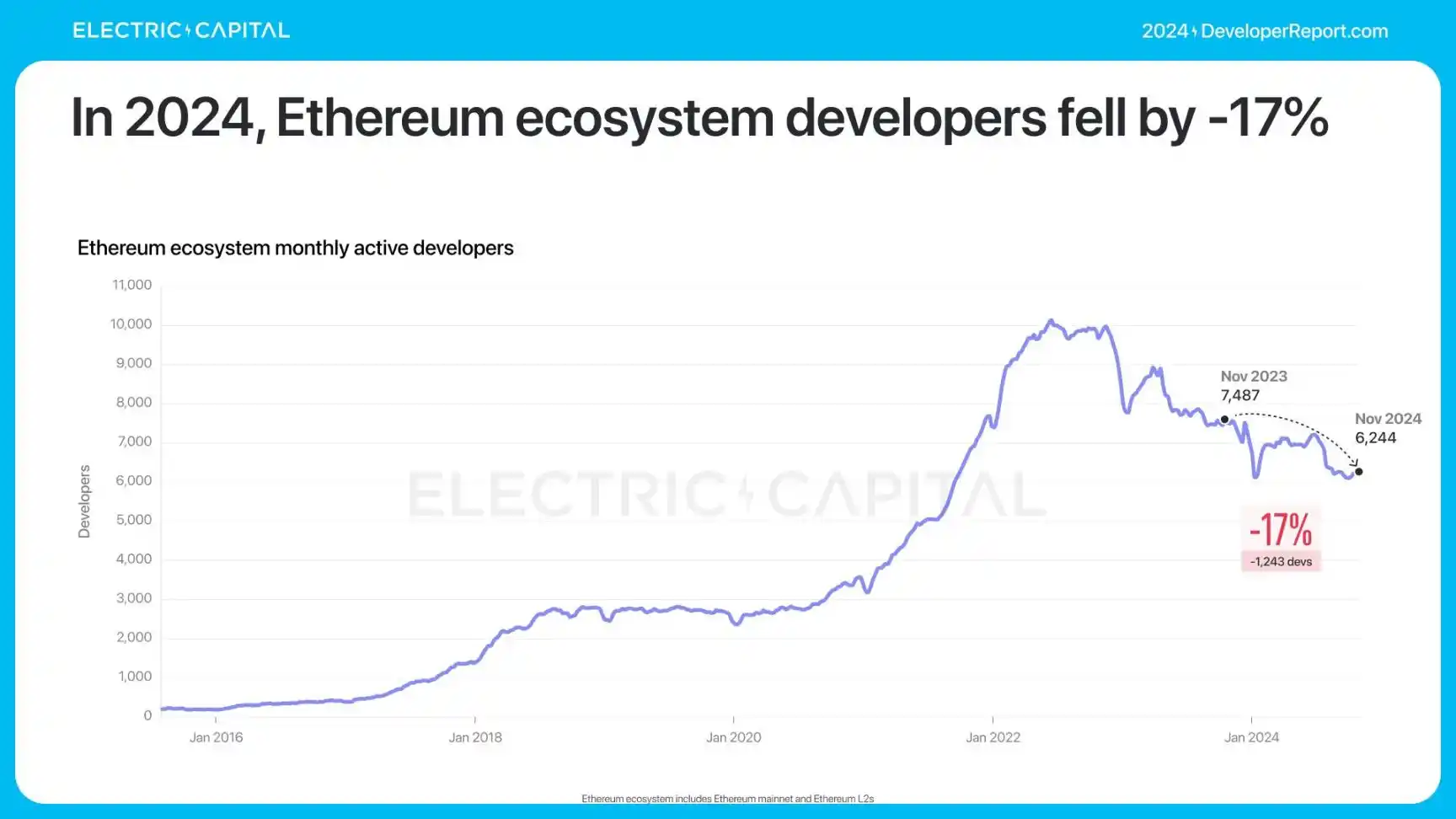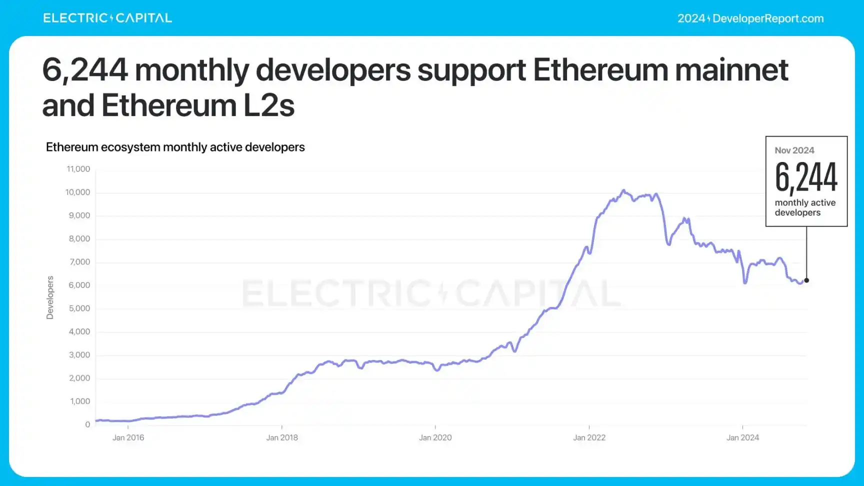 以太坊的每月活跃开发者为 6,244 人,同比下降了 17%。