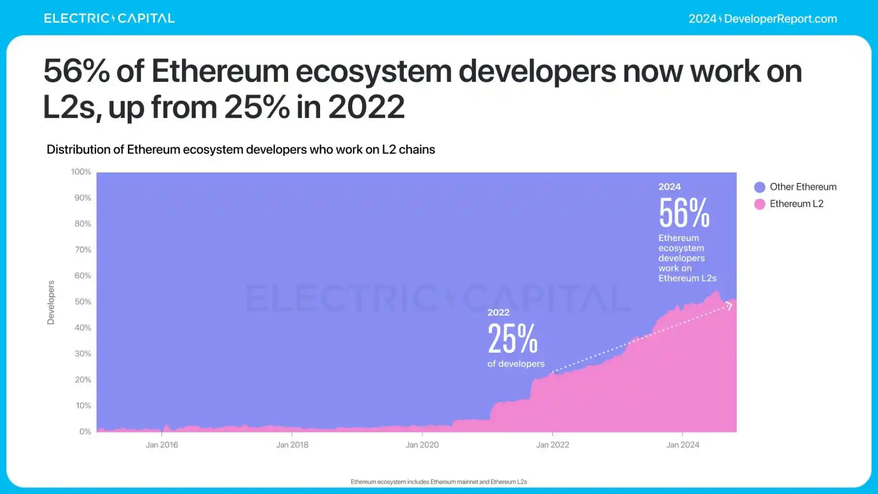 现在超过一半的以太坊开发者在以太坊 L2 链上工作,而这一比例在 2022 年为 25%。