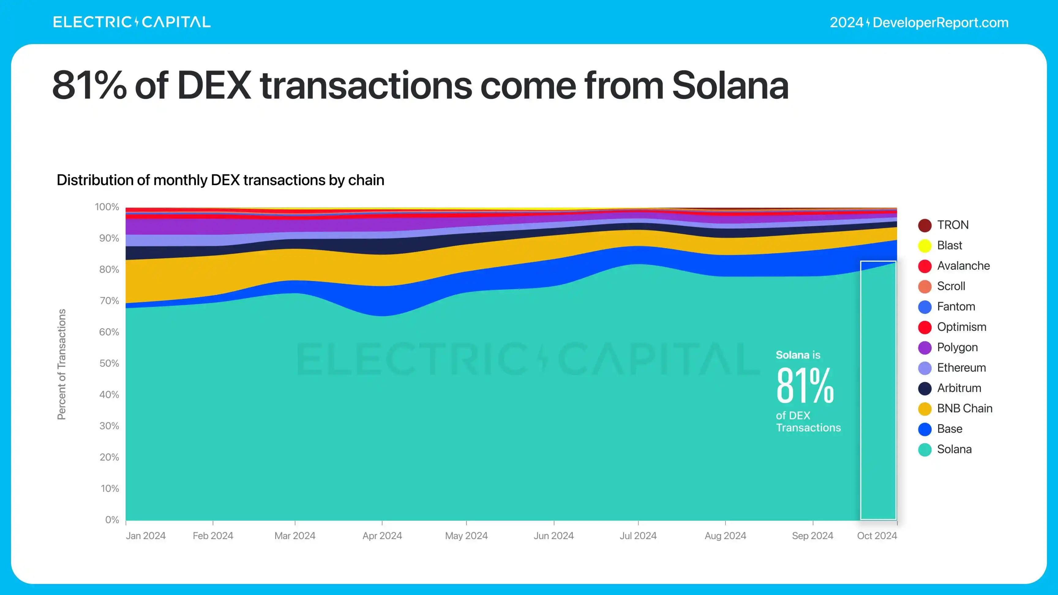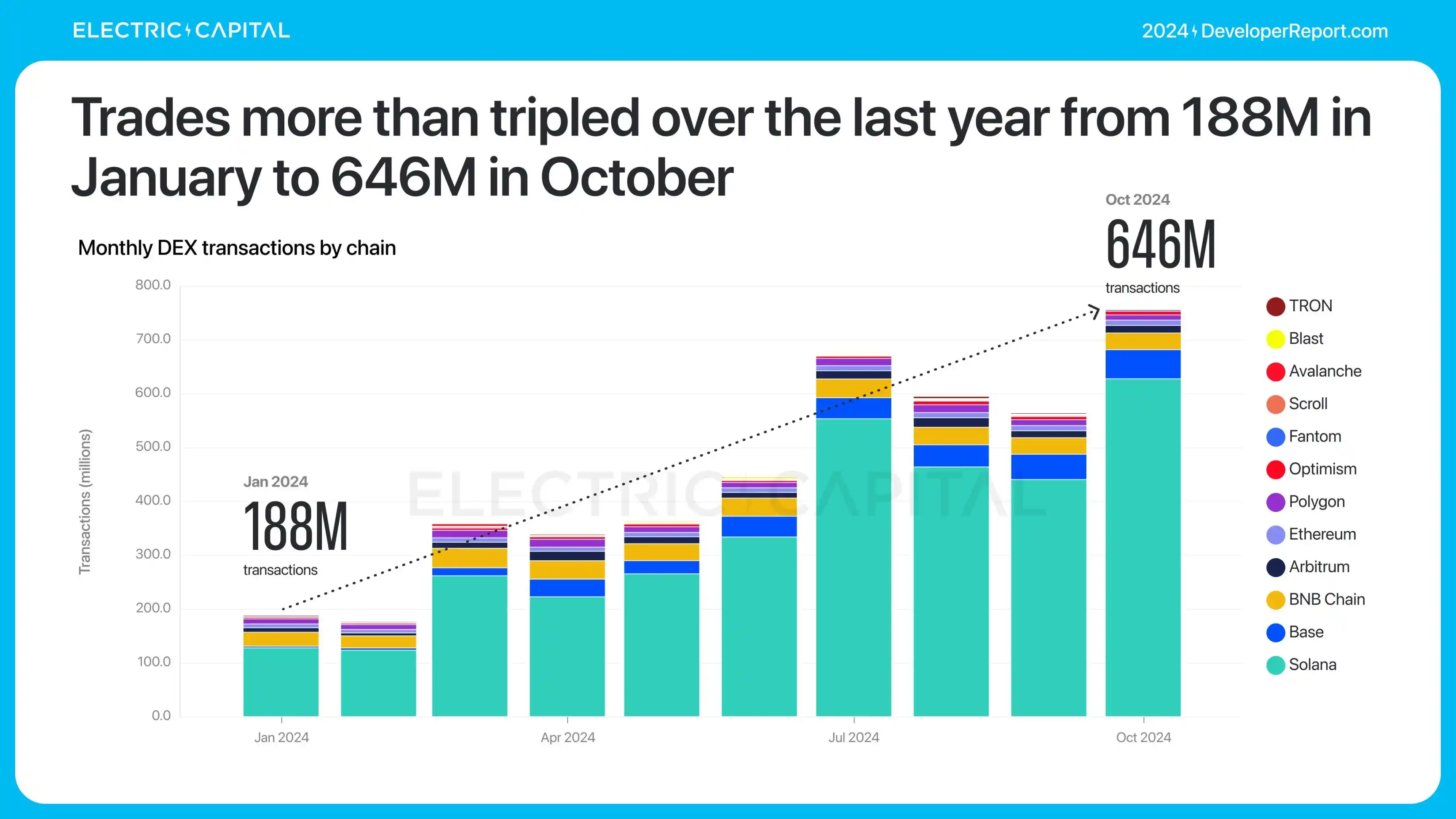 Solana 主导了低费用 DEX 的应用场景。2024 年,其交易量增长超过三倍,单月交易量达到 6.46 亿笔。