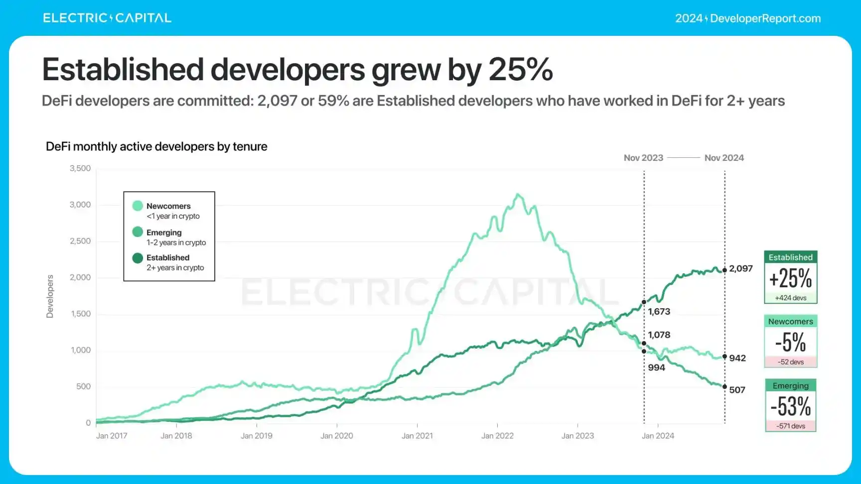 然而,从事加密行业超过两年的开发者数量增长了 27%。